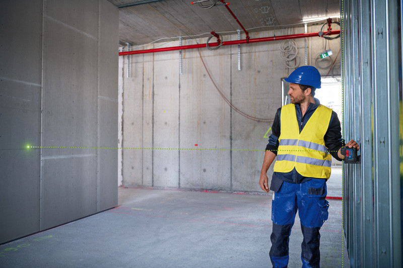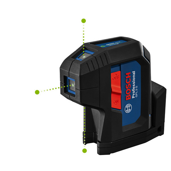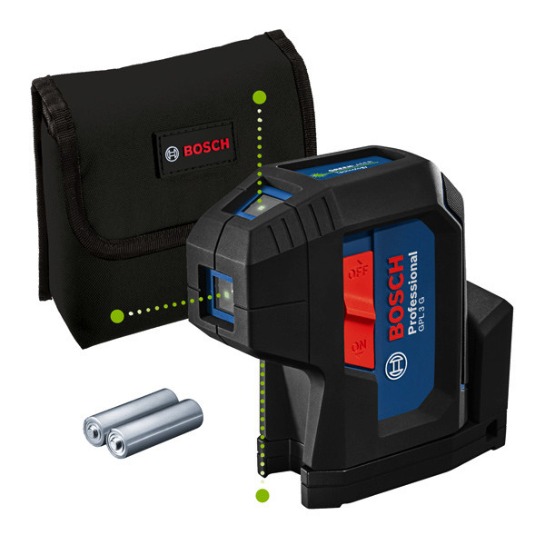 Punktlaser GPL 3 G, Durch sein strapazierfähiges und kleines Design eignet sich der 3-Punkt-Laser GPL 3 G Professional ideal für den Trockenbau. Seine grünen Laserpunkte bieten eine bis zu viermal bessere Sichtbarkeit als rote Punkte. Mit seinem gummiummantelten Gehäuse und dem eingelassenen Glas sowie Staub- und Strahlwasserschutz nach IP 65 hält der GPL 3 G Professional auch rauen Baustellenbedingungen stand. Dieser 3-Punkt-Laser ist mit einer eingebauten Drehhalterung mit starken Magneten ausgestattet, dies ermöglicht eine schnelle und sichere Werkzeugbefestigung und einen bequemen Transport. Der GPL 3 G Professional ist der ideale Helfer für die Übertragung von Referenzpunkten vom Boden zur Decke, z. B. bei der Installation von Innenraumbeleuchtung. Durch seine Formgebung eignet er sich perfekt für die Ausrichtung von Trockenwandunterkonstruktionen. Dieser 3-Punkt-Laser verfügt auch über ein benutzerfreundliches Interface mit einem Zweipositionsschalter: Beim Einschalten nivelliert der Laser sich automatisch selbst, beim Ausschalten wird die Pendelarretierung aktiviert. Tasche. 2 x 1,5 V LR6-Batterie (AA)