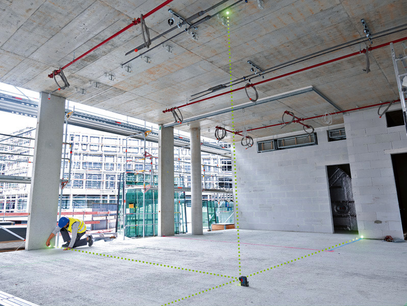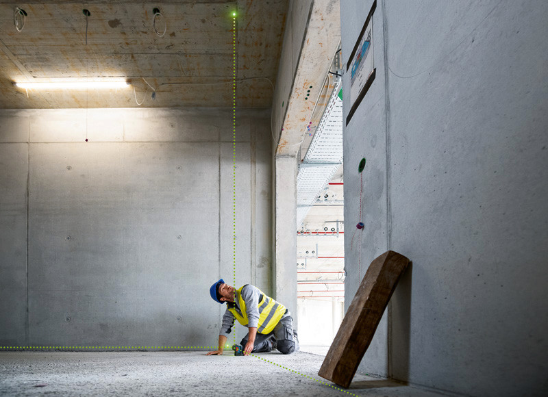 Punktlaser GPL 5 G, Der 5-Punkt-Laser GPL 5 G Professional überzeugt mit seinem strapazierfähigen und kompakten Design und ist die ideale Wahl für Übertragungen bei Wänden mit 90-Grad-Winkel. Seine grünen Laserpunkte bieten eine bis zu viermal bessere Sichtbarkeit als rote Punkte. Mit seinem gummiummantelten Gehäuse und dem eingelassenen Glas sowie Staub- und Strahlwasserschutz nach IP 65 eignet sich der GPL 5 G Professional auch für raue Baustellenbedingungen. Dieser 5-Punkt-Laser ist in kürzester Zeit transportbereit dank der eingebauten Drehhalterung mit starken Magneten für eine schnelle und sichere Werkzeugbefestigung. Der GPL 5 G Professional ist ideal für die Raumaufteilung mit 90-Grad-Winkeln und die Übertragung von Referenzpunkten vom Boden zur Decke. Er eignet sich sehr gut für Klempnerarbeiten und die Errichtung von Trockenbauwandrahmen. Dieser 5-Punkt-Laser verfügt auch über ein benutzerfreundliches Interface mit einem Zweipositionsschalter: Beim Einschalten nivelliert der Laser sich automatisch selbst, beim Ausschalten wird die Pendelarretierung aktiviert. Tasche. 2 x 1,5 V LR6-Batterie (AA)