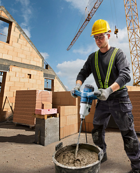 Rührwerk GRW 140, Wenn du einen Bohrer verwendest, um Zement, Farbe, Putz oder andere Baumaterialien zu mischen, kann es sehr anstrengend werden. Jetzt haben wir unser hocheffizientes Bosch Rührwerk GRW 140 Professional, das dir hilft, Zeit zu sparen und mit weniger Aufwand zu rühren. Mit diesem kabelgebundenen Gerät können dank des kraftvollen 1.400-W-Motors mühelos große Volumina gemischt werden. Und sein ergonomischer, radförmiger Griff ermöglicht dir, auch über viele Stunden hinweg bequem zu arbeiten. Dank der LED-Anzeige, die als Erinnerung dient, musst du nicht selbst aufpassen, wann die Kohlebürste ausgetauscht werden muss. Die Kohlebürste kann über einen leicht austauschbaren Deckel ausgetauscht werden. Als Bauunternehmer, Maler, Verputzer, Fliesenleger oder anderer Bau- und Maurerprofi wirst du die Leichtigkeit und Effizienz dieses kraftvollen Rührwerkzeugs schätzen. Es ist geeignet um Zement, Putz, Farbe, Mörtel und andere Materialien zu mischen. Karton (1 619 PC2 159)