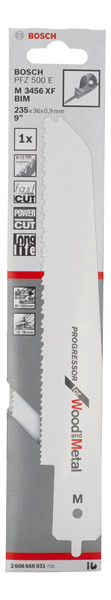 Säbelsägeblatt M 3456 XF für Bosch-Multisäge PFZ 500 E. M 3456 XF. BIM, geschränkt, gefräst. Holz mit Nägeln/Metall, Holz-/Spanplatten (10-150 mm), Bleche, Rohre, Profile (5-18 mm), Kunststoffe: Rohre, Profile (Ø10-150 mm)