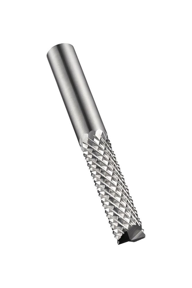 Router mit Schaftfräser Stirnverzahnungtyp · Durchmesser 8mm mit 25mm Schnittlänge · 63mm Gesamtlänge und 8mm Schaft · VHM mit gehärtetem Stahlschaft und blanker Oberfläche · GRP diamantform Schnitt mit mittlerer Zahnteilung zum Konturieren · Nuten- · Taschenfräsen und Ausschneiden von Formen in Polymere