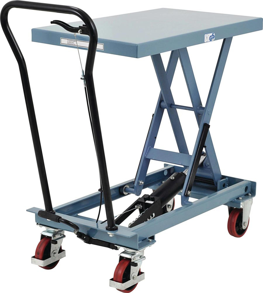 für ortsunabhängiges Heben und Zuführen von Lasten · stufenlose Handhebelabsenkung · Heben mittels Hydraulikfußpumpe · Einfachschere · robuste Konstruktion · Räder Polyurethan · Lenk- und Bockrollen, kugelgelagert · Lenkrollen mit Feststeller · hochwertige Mehrfachlackierung, taubenblau, RAL 5014 · entspricht EN 1570, prEN 1757-4