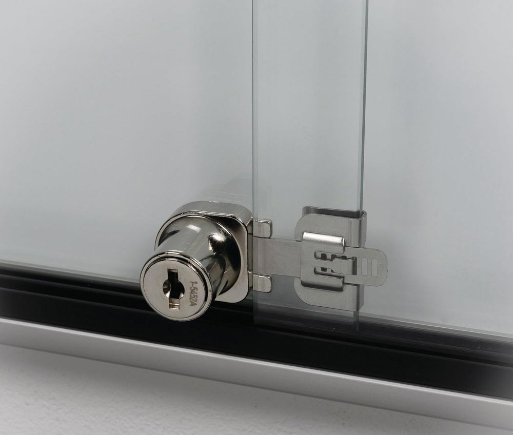 ∙ Abgerundete Aluminium-Profile, silberfarbig eloxiert · Schiebetüren aus ESG-Sicherheitsglas mit schwarzen Kunststoff-Laufschienen ∙ Abschließbar · Magnethaftende Rückwand in weiß ∙ Bautiefe 30 mm · Entsprechen den Brandschutzbestimmungen B1 ∙ Für die Wandmontage · Inkl. 4 Magnete