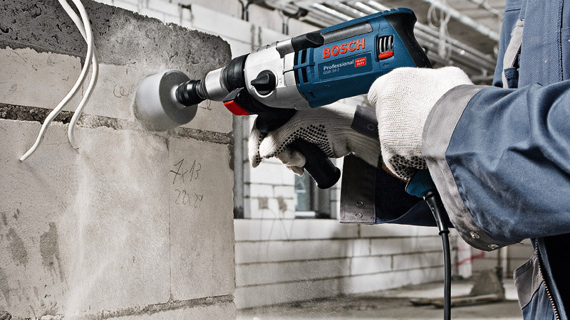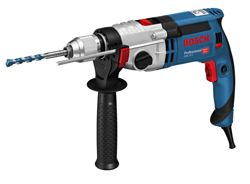 Schlagbohrmaschine GSB 24-2, Die kabelgebundene GSB 24-2 Professional ist eine 2-Gang-Schlagbohrmaschine mit KickBack Control für härtesten Einsatz. Mit 1.100-Watt-Hochleistungsmotor und hohem Drehmoment ideal für die meisten schweren Anwendungen. Erhöhter Anwenderschutz durch KickBack Control. Ausgestattet mit einem robusten Metallgetriebegehäuse ist diese Schlagbohrmaschine extrem robust für eine lange Lebensdauer. Dieses Elektrowerkzeug eignet sich zum Bohren in Mauerwerk, Stein, Holz und Metall. Es ist kompatibel mit der Staubabsaugung GDE 16 Cyl Professional. Die GSB 24-2 Professional verfügt über Funktionen wie Autolock, Überlastkupplung und Drehzahlvorwahl. Schnellspannbohrfutter 13 mm (2 608 572 150). Zusatzhandgriff (2 602 025 193). Tiefenanschlag 210 mm (1 613 001 010). L-Case (1 600 A00 M7X). 7tlg. Holzbohrer-Set (3/4/5/6/7/8/10 mm) (2 607 017 034). Lochsäge-Set (2 608 584 063)