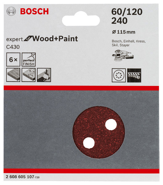 Schleifblatt C430, 115 mm, 60, 120, 240, 8 Löcher, Klett, 6er-Pack