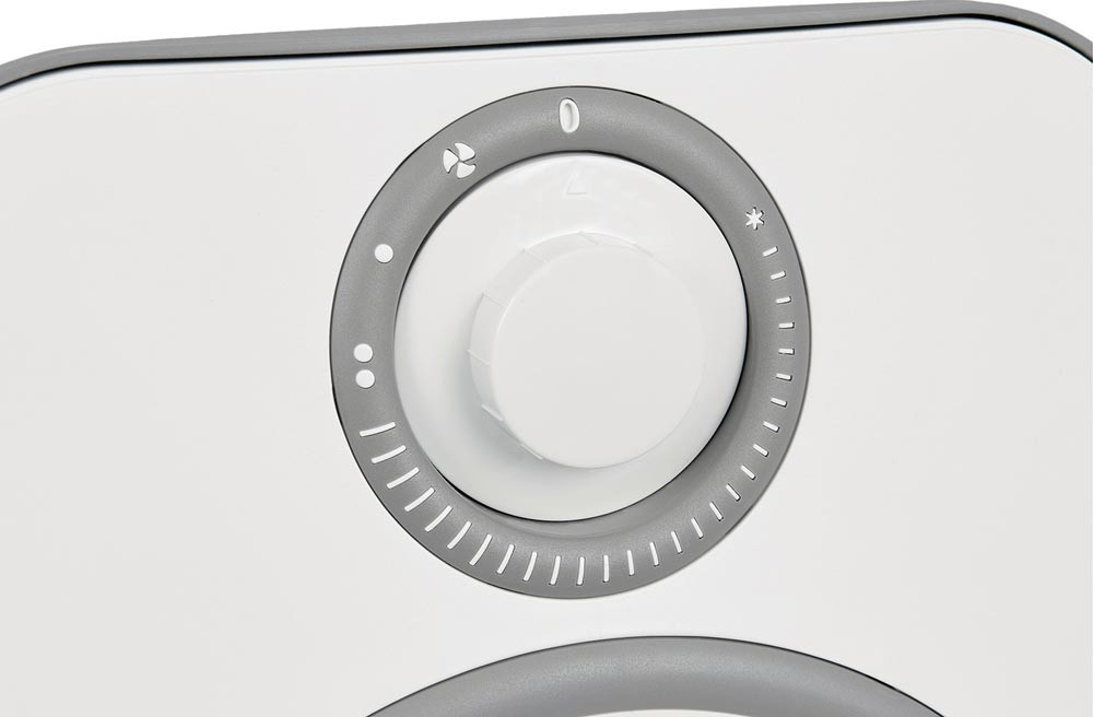 2 Heizstufen mit 1000/2000 Watt Leistung · 1 Kaltstufe, einstellbarer Thermostat · IP 21 – tropfwassergeschütztes Gehäuse · Ventilator-Funktion · Kabelaufwicklung · Kabellänge 115 cm