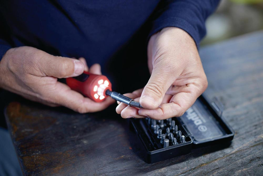 Lieferumfang: Schraubendreher Griff speedE® PocketDrive, 31-teilige Bitbox mit Schlitz, Phillips, Pozidriv, Sechskant, TORX®, magnetischer Bithalter, USB-Ladekabel (Typ USB-C), Softbox