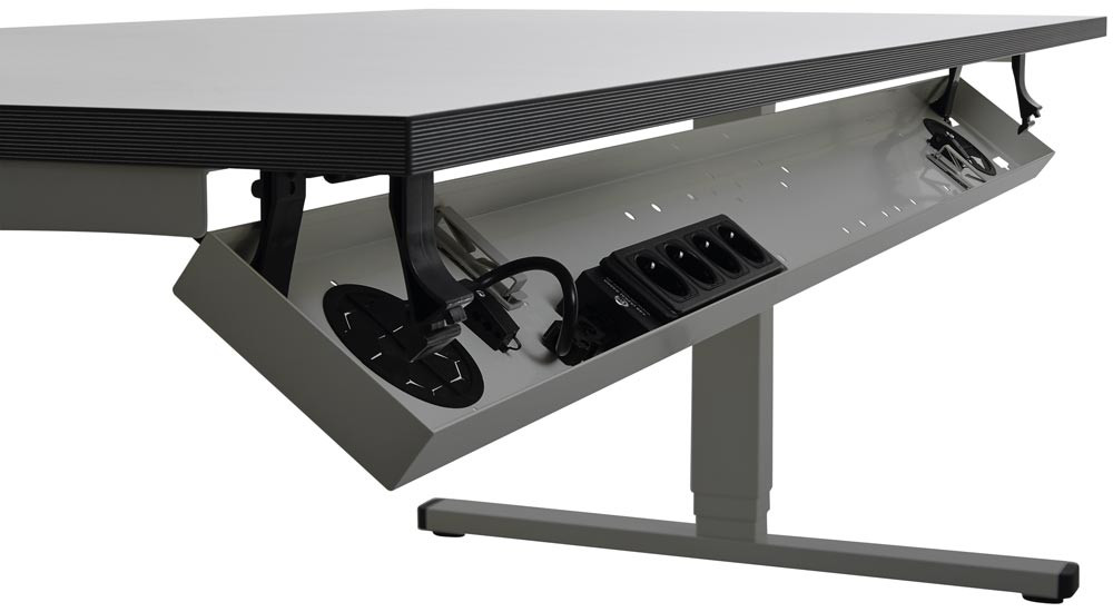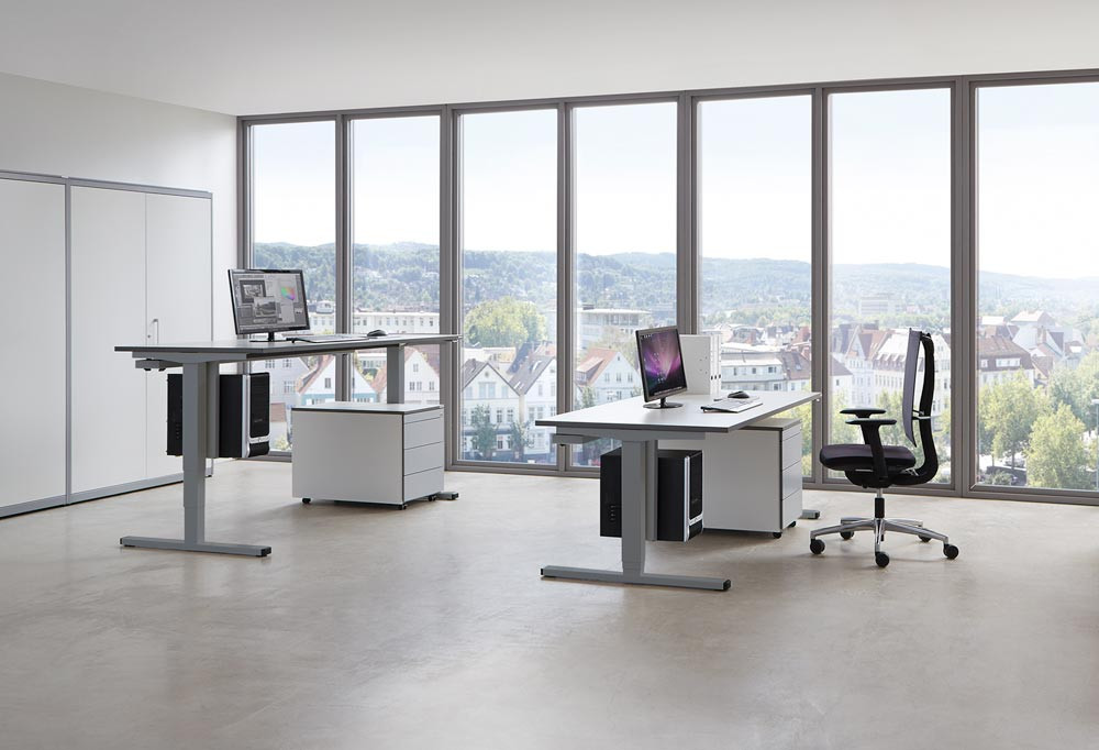 · Steh-/Sitzarbeitsplatz mit elektromotorischer Höhenverstellung · Stabile, robuste Bauweise für den täglichen Gebrauch · Melaminharzbeschichtete Tischplatte, 25 mm stark, mit ABS-Umleimer · T-Fuß-Gestell mit Nivelliergleitern für den Bodenausgleich · Geräuscharme, normgerechte Höhenverstellung von 650 bis 1250 mm · Integrierte Software-Kollisionserkennung (ISP), optional für höchste Sicherheit auch mit Sensor-Auffahrschutz (SAS) · Elektrifizierung erfolgt horizontal über einen abklappbaren Kabelkanal aus Stahlblech