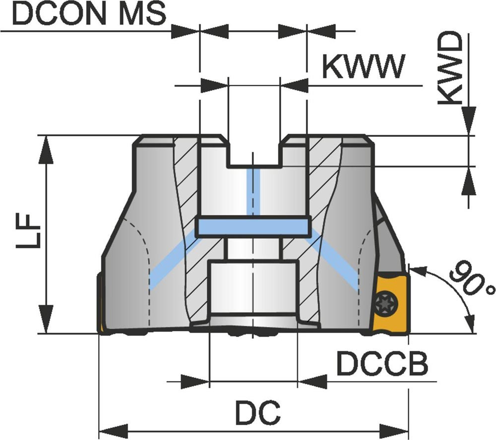 Eckfräser mit doppelt negativer Geometrie zum spannen von 8 Stück LNGX 1205.. oder LNGU 1205.. doppelseitigen Wendeschneidplatten · Schnittdurchmesser 100mm mit 90° Anstellwinkel und 32mm Verbindungsbohrung gemäß DIN 8030-A · 50mm Überstandslänge · Kühlkanalbohrung und ungleiche Teilung zum flachen Schulterfräsen · flachen Nutfräsen und Tauchfräsen mit einer maximalen Schnitttiefe von 9.0mm