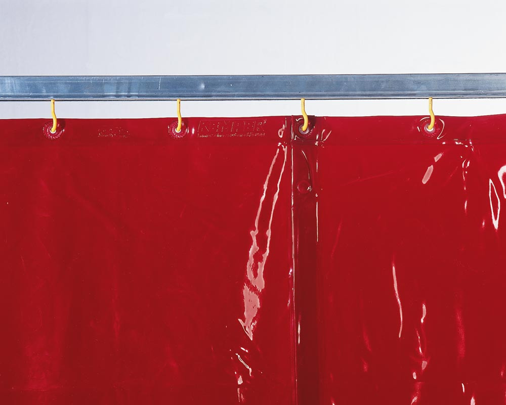 Ausführung: Schutzvorhang aus robustem, ca. 0,4 mm starken Kunststoff ∙ Funkenfest, schwer entflammbar ∙ Nach DIN EN ISO 25980 geprüft ∙ Zur Befestigung an einem Rohr oder an einem C-Profil ∙ Allseitig einreißfest gesäumt ∙ Verstärkte Ringösen zur Befestigung ∙ Eingeschweißte Kunststoffdruckknöpfe