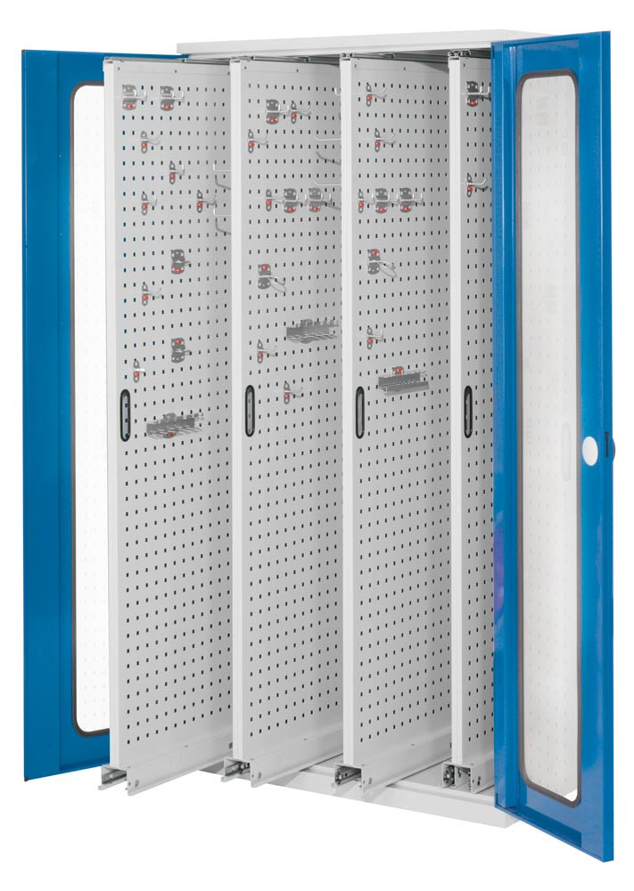 Schwerlastschrank, Sichtfenstertüren, 3 Vertikalauszüge, BxTxH 1000x600x1950 mm, RAL 7035 / RAL 5010