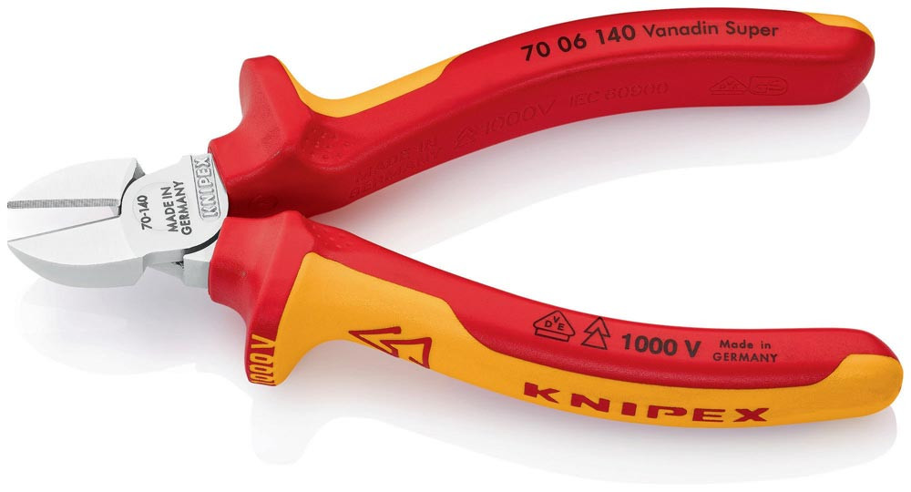 VDE-isoliert bis 1000 V · gefertigt gem. DIN EN/IEC 60900, stückgeprüft · schlanke Kopfform · sauberer Schnitt bei dünnen Cu-Drähten, auch an den Schneidenspitzen · Schneiden zusätzlich gehärtet, Schneidenhärte ca. 62 HRC · Vanadin-Elektrostahl, geschmiedet, mehrstufig ölgehärtet