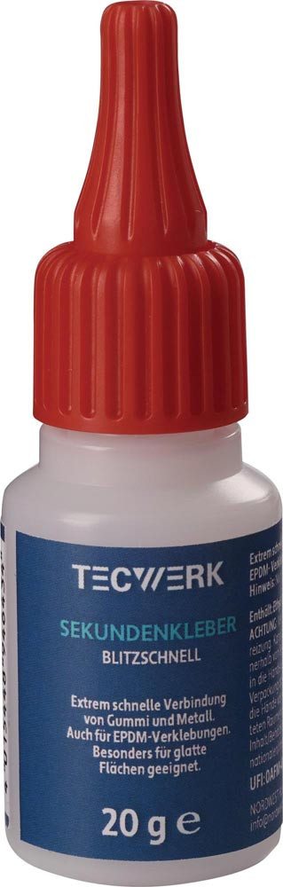 spezieller Cyanacrylatkleber · verklebt blitzschnell in nur einer Sekunde Kunststoffe und Metalle sowie deren Kombinationen · besonders geeignet für glatte Flächen · anwendbar in Elektrik- und Elektronikindustrie, Maschinenbau, Metallverarbeitung, Automobilbau, Kunststoffverarbeitung, Modellbau, Möbelindustrie u. v. a. · Viskosität: 3 bis 10 mPas (20 °C) · Spaltfüllvermögen: 0,05 mm · handfest nach: Aluminium: 5-10 Sekunden, Gummi: 2-5 Sekunden · temperaturbeständig von -50 °C bis +80 °C