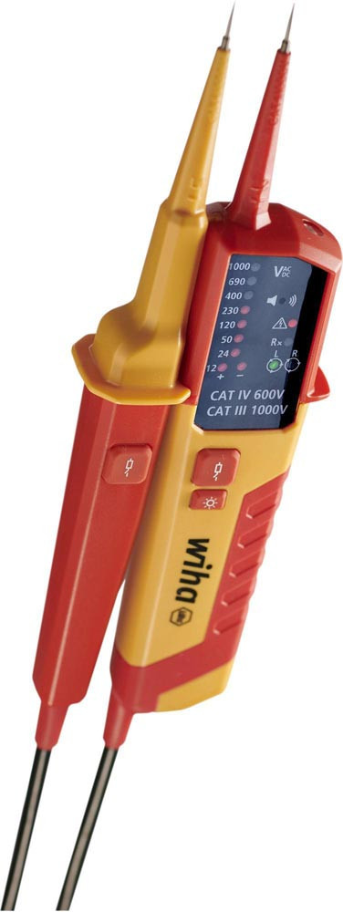 schnelle Einhandprüfung an Netzsteckdosen durch 19 mm Kontaktabstand · integrierte Taschenlampenfunktion sorgt für optimale Lichtverhältnisse. · Überprüfung der FI-Auslösung durch zwei Lasttasten · Spannungsprüfung im komfortablen Messbereich von 12 bis 1.000 V AC bzw. 1.500 V DC · zusätzlich bietet er die Möglichkeit der Durchgangsprüfung der optischen Drehfeldprüfung, der Einpolprüfung sowie der automatischen Polaritätserkennung · Messergebnisse sind dank einer LED-Anzeige einfach ablesbar ·ein zusätzlicher Signalton signalisiert den Stromfluss bei der Durchgangsprüfung · außerdem kann die Prüfung an Steckdosen komfortabel mit Hilfe des integrierten Abstandhalters einhändig durchgeführt werden · gleichzeitiges Drücken der Tasten an beiden Griffen der Prüfspitzen ermöglicht die Funktionsprüfung des FI-Schutzschalters durch das Zuschalten einer Last · gemäß den Messkategorien CAT III bis 1.000 V und CAT IV bis 600 V bietet der Spannungs- und Durchgangsprüfer maximale Sicherheit für Arbeiten im Bereich der Gebäudeinstallation sowie direkt an Quellen der Niederspannungsinstallation. IEC/EN 61243-3:2014 · IP64