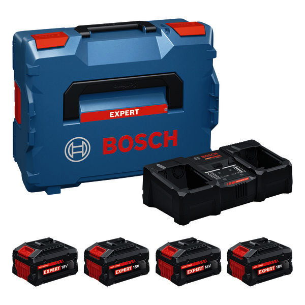 Starter-Set 2x EXBA18V-55 + 2x EXBA18V-80 + EXAL18V2-320, Der leistungsstarke Akku EXBA18V-80 liefert bis zu 120 % mehr Laufzeit selbst in harten Anwendungen (verglichen mit Professional GBA 18V 4.0Ah. interner Labortest. Schleifen auf Weichstahl mit GWS 18V-15 S + Fächerscheibe, Intervalle von 30 s mit 5 s Pausen). Er basiert auf fortschrittlicher Tabless-Zelltechnologie für eine Maximalleistung von bis zu 2400 W (interner Labortest. sofortige Maximalleistung, voll geladener, neuer Akku). Der Hochleistungsakku EXBA18V-55 liefert bis zu 2000 W Maximalleistung für anspruchsvolle Anwendungen in Kombination mit verbesserter Laufzeit (basierend auf internen Labortests. sofortige Maximalleistung mit voll geladenem neuem Akku). Mit ihrem verstärkten, robusten Gehäuse und dem hervorragenden Wärmemanagement mit COOLPACK 2.0 sorgen beide Akkus für Robustheit und eine lange Lebensdauer. Das EXAL18V2-320 lädt zwei Akkus gleichzeitig mit 16 A, sodass zwei EXBA18V-80-Akkus in nur 39 Minuten und zwei EXBA18V-55-Akkus in 31 Minuten vollständig geladen werden. Das Ladegerät verfügt über die intelligenten Technologien Active Air Cooling 3.0 und FlexTemp Charging, die den Temperaturbereich auf von 10 °C bis +55 °C erweitern. Es reduziert die Ausfallzeiten erheblich, indem es ein schnelles Aufladen von warmen und kalten Akkus ermöglicht, die alle bequem in der speziell angefertigten L-BOXX aufbewahrt werden. Der EXBA18V-80 und der EXBA18V-55 besitzen eine 5-LED-Anzeige für den Ladezustand mit Restkapazität und Defektrisikoerkennung. Das mobile, ultraschnelle Parallelladegerät bietet drei Lademodi, Standard, Power Boost und Long Life, und verfügt über 5 LEDs für eine präzise Ladeanzeige. Kompatibel mit dem Bosch Professional 18V System und der markenübergreifenden AMPShare Akku-Allianz. Der EXBA18V-80 wiegt 1,04 kg, während der EXBA18V-55 ein Gewicht von 1,02 kg hat. L-BOXX 162 Größe 5 (1 605 438 1L3)