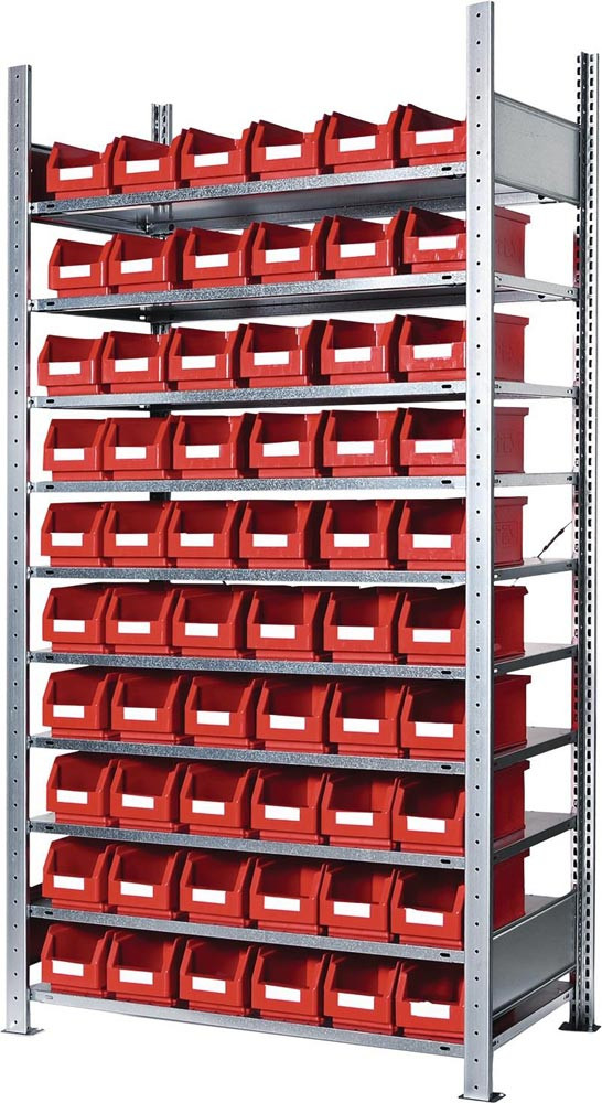 komplett mit Sichtlagerkästen Raster-Plan°· einfache und schnelle Steckmontage mit vormontierten verzinkten Rahmen · Fachböden verzinkt mit verstärktem Kastenprofil, H 25 mm, höhenverstellbar im 25-mm-Raster · Tragfähigkeit pro Fachboden 150 kg · Feldlast 1300 kg