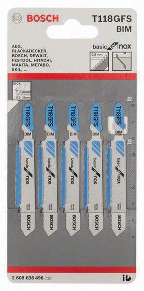 Stichsägeblatt T 118 GFS Basic for Stainless Steel. Das T 118 GFS Basic for Stainless Steel Stichsägeblatt macht gerade Schnitte in Edelstahl. Die gefräste · gewellte Zahngeometrie ist zum Schneiden von Edelstahl konzipiert. Die Zahnleiste aus gehärtetem speziellem HSS (Hochgeschwindigkeitsstahl) und BIM (Bimetall) ist mit hochelastischem HCS (Kohlenstoffstahl) verstärkt und bietet sowohl genügend Festigkeit als auch Flexibilität · die beide erforderlich sind · um dünne · massive und perforierte Bleche aus Edelstahl zu schneiden. Die sehr feine Zahnteilung (0,8 mm) schneidet zudem sehr dünne Bleche aus Edelstahl mit einer Dicke von 0,5 bis 1,5 mm. Für den Gebrauch mit Stichsägen mit T-Schaft-Aufnahme. Einnockenschaft. Gut und günstig. Inhalt der Verkaufspackung: 5 Stück.