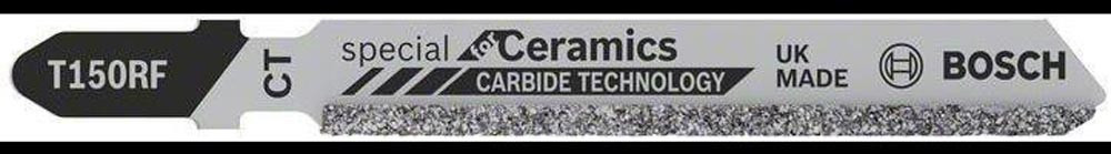 Stichsägeblatt T 150 RF Special for Ceramics. Das T 150 RIFF Special for Ceramics Stichsägeblatt ist besonders robust bei sauberen geraden Schnitten in Sonderwerkstoffen. Der feingeschliffene Hartmetallkorn ist für wiederholte feine Anpassungsschnitte in abrasiven Keramikmaterialien konzipiert. Die Zahnleiste ist zudem mit der Hartmetalltechnologie an einen hochelastischen Kohlenstoffstahlkörper geschweißt · wodurch das Blatt durch sehr robuste Materialien · wie z. B. Wandfliesen in Keramik · schneiden kann. Der feingeschliffene Hartmetallkorn (K50) schneidet weiche Wandfliesen aus Keramik mit einer Dicke von 5 bis 10 mm. Für den Gebrauch mit Stichsägen mit T-Schaft-Aufnahme. Einsatzbereiche: Für weiche keramische Wandfliesen · GFK und Gusseisen von 5 bis 10 mm. Feiner Schnitt.