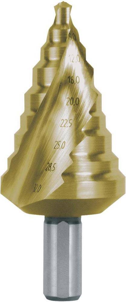Stufenbohrer Bohrbereich 6-32 mm HSS TiN spiralgenutet Schneidenanzahl 2 Stufenanzahl 9