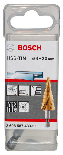 Stufenbohrer HSS-TiN, 4 - 20 mm, 1/4-Zoll, 70,5 mm, 9 Stufen