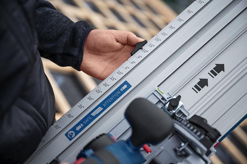 Systemzubehör FSN 300 X, Bei Tischler- und Dachdeckarbeiten oder beim Holzrahmenbau ist ein Werkzeug erforderlich, das jederzeit zuverlässige Winkelschnitte ermöglicht. Unsere Bosch Professional Führungsschiene für Querschnitte FSN 300 X ist ideal für Schnittwinkel von -45° bis +60°. Winkel sind mühelos einstellbar und es können Materiallängen von 300 mm bei 90° geschnitten werden. Diese flexible Führungsschiene für Querschnitte ist kompatibel mit der Kreissäge GX und lässt sich mühelos auf das Werkzeug schieben. Die Führungsschiene mit ihrem robusten Spanreißschutz ist garantiert langlebig. Darüber hinaus wird das Werkstück durch ihre sichere, rutschfeste Haftbeschichtung geschützt. Dies ist die ideale Führungsschiene für Querschnitte beim Schneiden von Holz- oder Holzverbundwerkstoffen in Balken, Fensterrahmen, kleinen Platten für Böden, Decken, Verkleidungen, Wandrahmen und mehr. Sie kann auch zum Zuschneiden von Dämmmaterial verwendet werden. Die Bosch Professional Führungsschiene für Kappschnitte FSN 300 X hat die Maße 436 mm x 228 mm x 49 mm. Karton