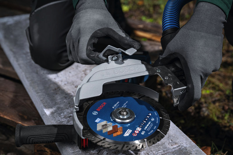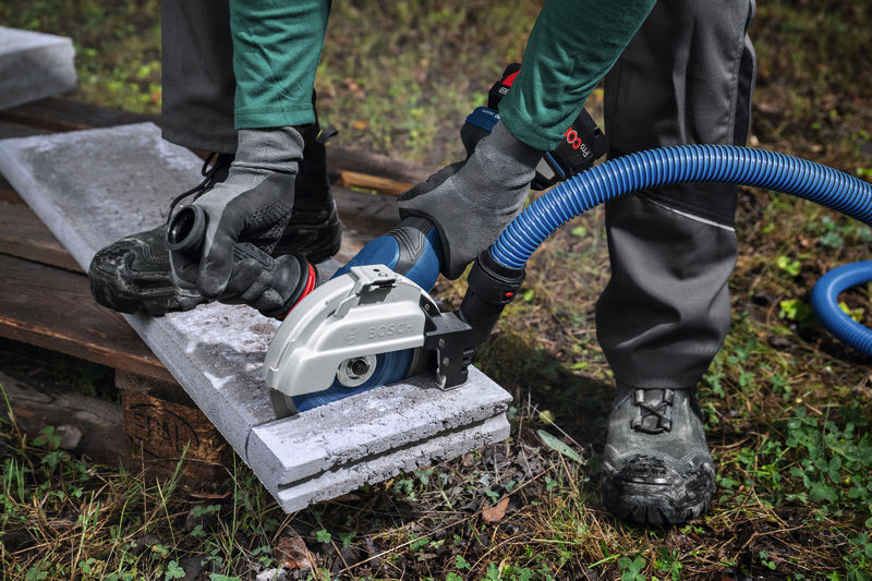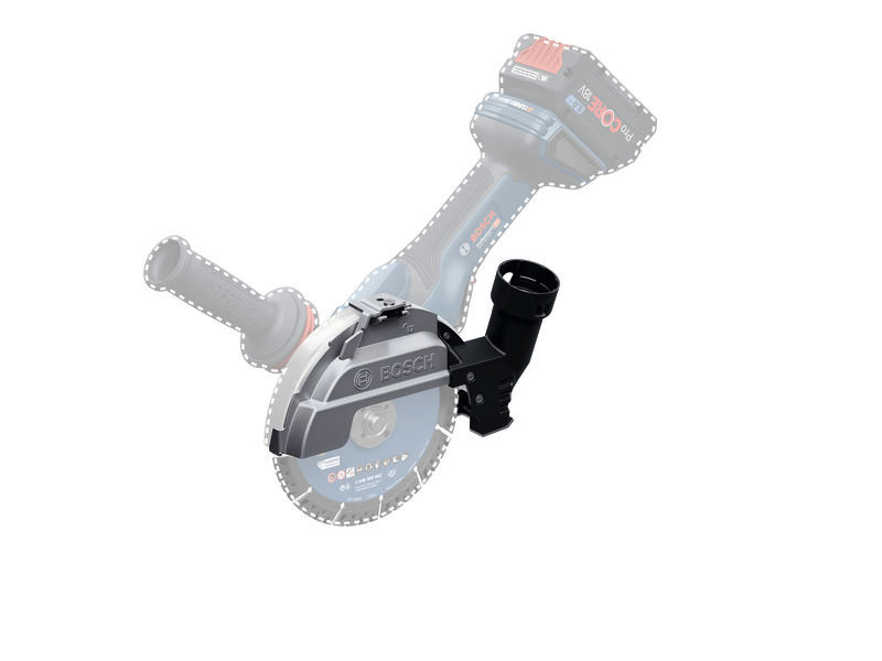 Systemzubehör für große Winkelschleifer GDE 180-CG, Beim Trennen in Beton oder Stein entsteht feiner Silikastaub, der in die Luft gelangt, eine Gesundheitsgefahr darstellt und zu langfristigen Atemproblemen führen kann. Die Absaughaube GDE 180-CG Professional nimmt den Staub dort auf, wo er entsteht, und ermöglicht so staubarmes Trennen. Sie ist mit allen Bosch Professional Winkelschleifern mit 180 mm Scheibendurchmesser kompatibel. Durch den gleichen einfachen und intuitiven Anklipsmechanismus wie bei der Schutzhaube zum Trennen kann die Absaughaube einfach auf die Schutzhaube zum Schleifen gesteckt werden, ohne die Scheibe oder Schutzhaube demontieren zu müssen. Wenn sie sicher befestigt ist, kann die Absaughaube über die Click & Clean Schnittstelle mit einem Sauger verbunden werden für eine einwandfreie Staubabsaugung und eine gesündere, staubärmere Arbeitsumgebung. Die Absaughaube Bosch GDE 180-CG Professional kann zum Absaugen von Staub beim Trennen in Beton, Stein oder Ziegelstein verwendet werden. Sie wird empfohlen für Handwerker, die häufig mit solchen Materialien arbeiten, wie z. B. Garten- und Landschaftsbauer, Gärtner, Dachdecker, Zimmerer und Holzrahmenbauer. Die Bosch GDE 180-CG Professional ist eine werkzeuglos anklipsbare Absaughaube, die einwandfrei über die Bosch Professional Click & Clean Schnittstelle mit Saugern verbunden werden kann. Karton