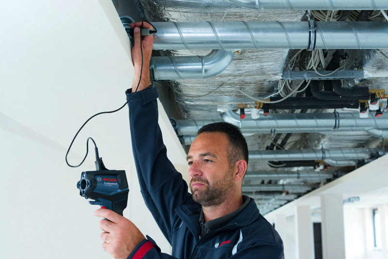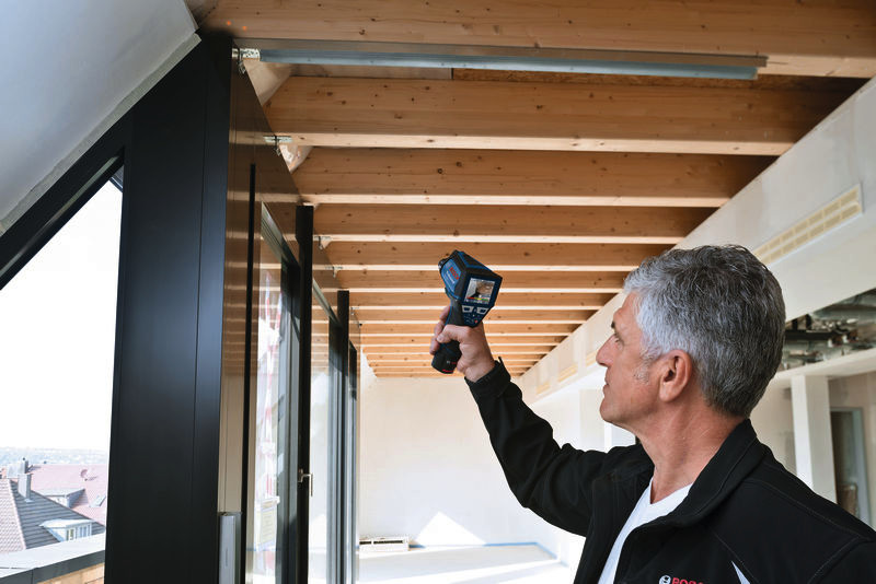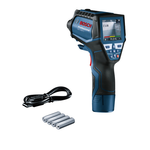 Thermodetektor GIS 1000 C, Der Thermodetektor GIS 1000 C Professional ist die schnelle Lösung für eine genaue Anzeige und Dokumentation von Temperaturen und relativer Luftfeuchtigkeit. Während der Messwertaufnahme erstellt die integrierte Kamera bequem Fotos für eine sofortige Anzeige mit den jeweiligen Messwerten. Detaillierte Daten werden schnell dokumentiert und können außerdem mit der Bosch ThermalOn App über eine Bluetooth®-Verbindung mit Remote-Geräten geteilt werden. Der Thermodetektor bietet eine Temperaturdokumentation für professionelle Anwender: fünf verschiedene Einstellungen für komplexe Oberflächen und Kontakttemperaturen (mit integrierter Typ-K-Schnittstelle), Berechnung von Taupunkt und Wärmebrücken, Anwendermodus für anwenderspezifische Werte. Professionelle Anwender können den Thermodetektor für ein breites Anwendungsspektrum nutzen, von der Schimmelgefahrbestimmung bis zur Prüfung auf Wärmebrücken, sowie genaue Kontaktmessungen bei reflektierenden Oberflächen, Flüssigkeiten und direkter Lufttemperatur. Neben dem Messen von Oberflächen- und Kontakttemperaturen erfasst der Umgebungssensor des GIS 1000 C Professional auch schnell die Umgebungsbedingungen und führt für ein noch breiteres Anwendungsspektrum präzise Messungen von Raumtemperatur und relativer Luftfeuchtigkeit durch. Ein übersichtliches User Interface ermöglicht eine intuitive Bedienung und liefert sehr genaue Ergebnisse in einem breiten Messbereich. Der GIS 1000 C Professional eignet sich nicht für medizinische Zwecke. AA1 Alkaline Akku-Adapter (1 608 M00 C1B). Quickstart Karte. 4 x 1,5 V-LR6-Batterie (AA). Micro-USB-Kabel (2 609 120 670). L-BOXX-Einlage für Gerät