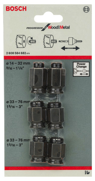 Das Übergangsadapter-Set enthält eine Vielfalt an Adaptern, die die Verwendung von Power-Change-Systemen von Bosch für Lochsägen von Wettbewerbern wie Starrett, Baco und Lenox ermöglichen. Dieses Paket enthält zwei Adapter für die Durchmesser 1430 mm (1/2"-20UNF-Gewinde) und vier Adapter für die Durchmesser 32210 mm (5/8"-18UNF-Gewinde).