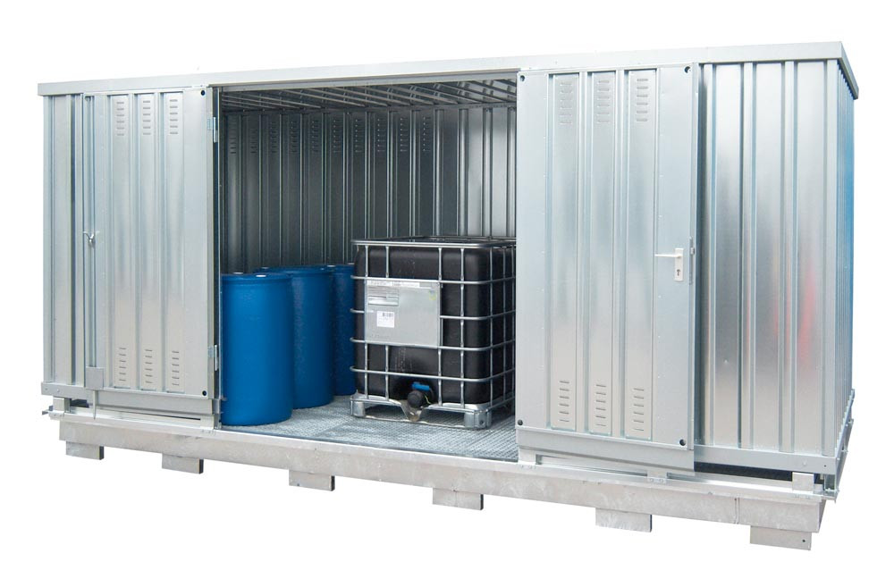 ∙ Robuste und verzinkte Stahlblechkonstruktion inkl. Kranösen und Doppelflügeltüren ∙ Feuerverzinkte Auffangwannen mit Gitterrost, max. Traglast 1000 kg/qm bei verteilter Last