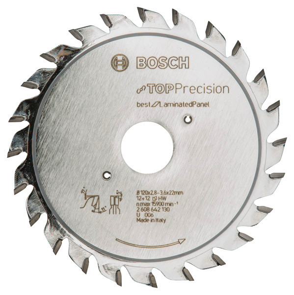 Das Top Precision Best for Laminated Panel Vorritzsägeblatt ermöglicht industriequalitative Präzision für sehr anspruchsvolle Anwendungen bei laminierten Paneelen, die an einer oder zwei Seiten beschichtet sind. Diese hohe Leistung und Qualität werden durch die einzigartigen besonders harten Microteq-Zähne verstärkt, die intern bei Bosch hergestellt werden, und aus robustem Carbide-Korn bestehen. Cleanteq reduziert zudem die Anhaftung von Rückständen, wie z. B. Harz und Klebstoff, um besonders saubere Ergebnisse sicherzustellen, während Korrosion verhindert und das Blatt kühl gehalten wird. Das einstellbare Vorritzsägeblatt ist für das Schneiden von Spanplatten, Paneelmaterialien und furniertem Laminat konzipiert. Das Top Precision Best for Laminated Panel Vorritzsägeblatt verfügt über eine ATB-Zahngeometrie (Wechselzahn), wodurch saubere Schnitte in alle Arten an Holz und laminierten Paneelen ermöglicht werden.