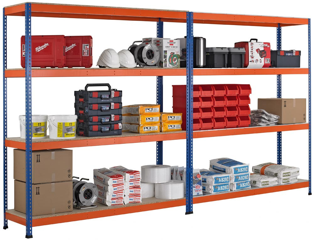 Weitspannregal, 4 Lagerebenen mit Spanplattenboden, BxTxH 2146x469x1981 mm, Fachlast 577 kg, Ständer blau, Traversen orange