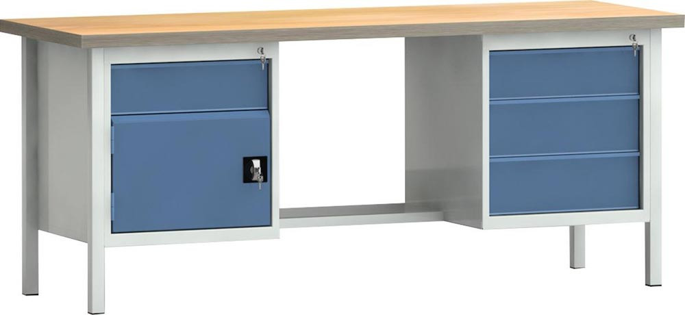 Werkbank PW 700 B2000xT700xH840mm Buche Multiplex lichtgrau / brillantblau 2 Schubl. 2 Türen E6002613