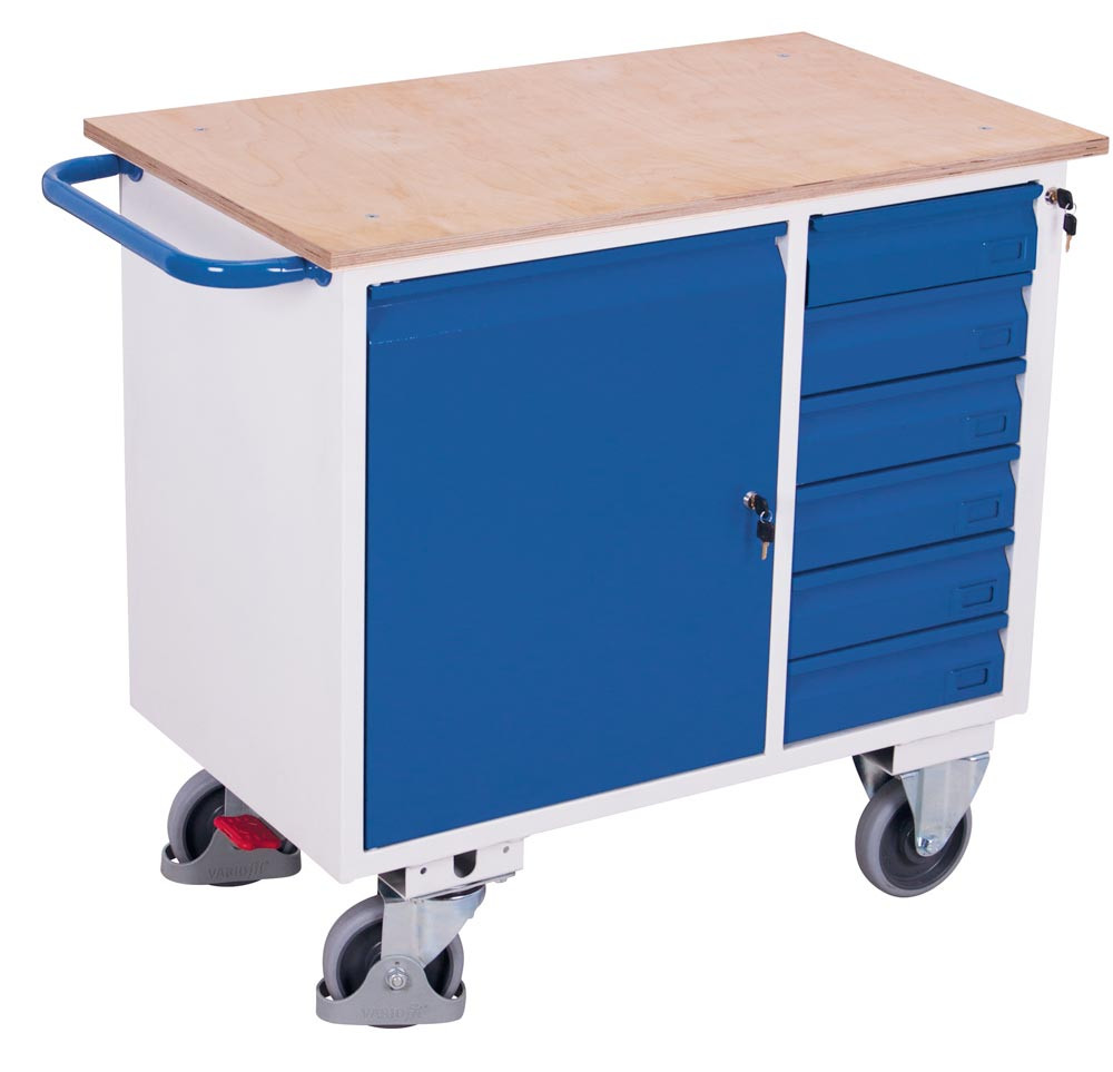 ∙ Stabile Stahlblechkonstruktion ∙ Arbeitsplatte Buchensperrholz ∙ Oberfläche der Schränke pulverbeschichtet ∙ Korpus RAL 7035 Lichtgrau, Front/Rahmen RAL 5010 Enzianblau ∙ Ladefläche B x T 1000 x 600 mm ∙ Türenschränke mit 1 festen und 2 variablen Böden, Traglast 30 kg ∙ 6 Schubladen (BxTxH 290x475x95 mm) mit Gleitführung, Traglast 25 kg ∙ Rollen aus thermoplastischem Gummi, grau (spurlos), 2 Lenkrollen inkl. zentraler Fußbremse EasySTOP und 2 Bockrollen, Ø 160 mm ∙ Belastbarkeit max. 400 kg