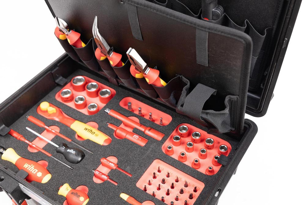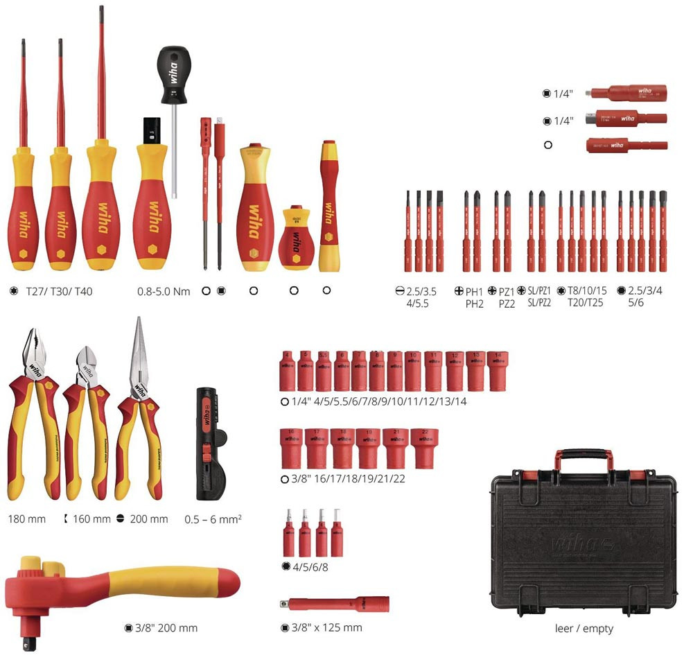 1x Seitenschneider Industrial electric mit DynamicJoint® 160 mm · 6 1/2″ (43336) 1x Kombizange Industrial electric mit DynamicJoint® und OptiGrip mit extra langer Schneide 180 mm · 7″ (33186) 1x Flachrundzange Industrial electric mit Schneide gebogene Form · ca. 40° 200 mm · 8″ (35462) 1x Abisolier-Multitool für Rundkabel 125 mm · 5″ (44242) 1x Schraubendreher SoftFinish® electric slimFix TORX® T27 x 125 mm (36540) 1x Schraubendreher SoftFinish® electric slimFix TORX® T30 x 125 mm (36541) 1x Schraubendreher SoftFinish® electric slimFix TORX® T40 x 150 mm (36542) 1x Ratschenschlüssel isoliert für Steckschlüssel 3/8″ umschaltbar 200 mm (43052) 1x Verlängerung isoliert 3/8″ für Steckschlüsseleinsätze isoliert 125 mm (43057) 1x Vierkant-Adapter isoliert 3/8“ für 1/4″ Steckschlüssel (44355) 1x Schraubendreher mit Bithalter Set SoftFinish® slimVario® electric 4-tlg. mit slimBits auf SB-Karte (43449) 1x Feinschraubendreher Set PicoFinish® slimVario® electric 4-tlg. mit slimBits (43167) 1x Schraubendreher mit Bithalter SoftFinish® electric slimVario Stubby für slimBits 6,0 mm (41229) 1x Verlängerung slimVario® electric für slimBits 6,0 mm x 69,5 mm (43292) 1x Adapter slimVario® electric für 1/4″ Steckschlüssel 59 mm (43139) 1x Drehmoment-Schraubendreher TorqueVario®-S electric variabel einstellbare Drehmomentbegrenzung 0.8 - 5 (26626) 1x Adapter TorqueVario-S electric für 1/4″ Steckschlüssel (43128) 1x Bit slimBit electric Schlitz 2,5 mm x 75 mm (34578) 1x Bit slimBit electric Schlitz mit Zapfen 3,5 mm x 75 mm (44385) 1x Bit slimBit electric Schlitz 4,0 mm x 75 mm (34580) 1x Bit slimBit electric Schlitz 5,5 mm x 75 mm (34581) 1x Bit slimBit electric Phillips PH1 x 75 mm (34583) 1x Bit slimBit electric Phillips PH2 x 75 mm (34584) 1x Bit slimBit electric Pozidriv PZ1 x 75 mm (34585) 1x Bit slimBit electric Pozidriv PZ2 x 75 mm (34586) 1x Bit slimBit electric PlusMinus/Pozidriv SL/PZ1 x 75 mm (34589) 1x Bit slimBit electric PlusMinus/Pozidriv SL/PZ2 x 75 mm (34590) 1x Bit slimBit electric TORX® T8 x 75 mm (35506) 1x Bit slimBit electric TORX® T10 x 75 mm (35507) 1x Bit slimBit electric TORX® T15 x 75 mm (35508) 1x Bit slimBit electric TORX® T20 x 75 mm (35509) 1x Bit slimBit electric TORX® T25 x 75 mm (36071) 1x Bit slimBit electric Sechskant 2,5 mm x 75 mm (37224) 1x Bit slimBit electric Sechskant 3,0 mm x 75 mm (37147) 1x Bit slimBit electric Sechskant 4,0 mm x 75 mm (37225) 1x Bit slimBit electric Sechskant 5,0 mm x 75 mm (37226) 1x Bit slimBit electric Sechskant 6,0 mm x 75 mm (37227) 1x Steckschlüsseleinsatz isoliert 1/4″ Außensechskant 4,0 mm x 42 mm (43088) 1x Steckschlüsseleinsatz isoliert 1/4″ Außensechskant 5,0 mm x 42 mm (43089) 1x Steckschlüsseleinsatz isoliert 1/4″ Außensechskant 5,5 mm x 42 mm (10102) 1x Steckschlüsseleinsatz isoliert 1/4″ Außensechskant 6,0 mm x 42 mm (43091) 1x Steckschlüsseleinsatz isoliert 1/4″ Außensechskant 7,0 mm x 42 mm (10103) 1x Steckschlüsseleinsatz isoliert 1/4″ Außensechskant 8,0 mm x 42 mm (43093) 1x Steckschlüsseleinsatz isoliert 1/4″ Außensechskant 9,0 mm x 42 mm (10104) 1x Steckschlüsseleinsatz isoliert 1/4″ Außensechskant 10,0 mm x 42 mm (43095) 1x Steckschlüsseleinsatz isoliert 1/4″ Außensechskant 11,0 mm x 42 mm (43096) 1x Steckschlüsseleinsatz isoliert 1/4″ Außensechskant 12,0 mm x 42 mm (10105) 1x Steckschlüsseleinsatz isoliert 1/4″ Außensechskant 13,0 mm x 42 mm (43098) 1x Steckschlüsseleinsatz isoliert 1/4″ Außensechskant 14,0 mm x 42 mm (43099) 1x Steckschlüsseleinsatz isoliert 3/8″ Außensechskant 16,0 mm x 45 mm (43071) 1x Steckschlüsseleinsatz isoliert 3/8″ Außensechskant 17,0 mm x 45 mm (43072) 1x Steckschlüsseleinsatz isoliert 3/8″ Außensechskant 18,0 mm x 45 mm (43073) 1x Steckschlüsseleinsatz isoliert 3/8″ Außensechskant 19,0 mm x 47 mm (43074) 1x Steckschlüsseleinsatz isoliert 3/8″ Außensechskant 21,0 mm x 47 mm (43075) 1x Steckschlüsseleinsatz isoliert 3/8″ Außensechskant 22,0 mm x 47 mm (43076) 1x Steckschlüsseleinsatz isoliert 1/4″ Innensechskant 4,0 mm x 65 mm (43110) 1x Steckschlüsseleinsatz isoliert 1/4″ Innensechskant 5,0 mm x 65 mm (43111) 1x Steckschlüsseleinsatz isoliert 1/4″ Innensechskant 6,0 mm x 65 mm (43112) 1x Steckschlüsseleinsatz isoliert 1/4″ Innensechskant 8,0 mm x 65 mm (43113) 1x Koffer