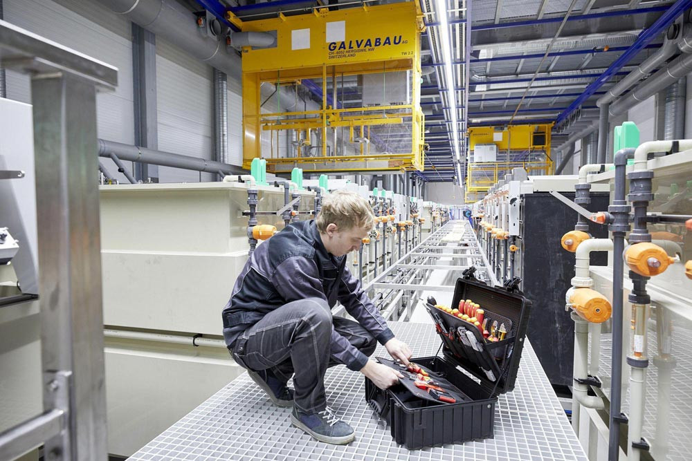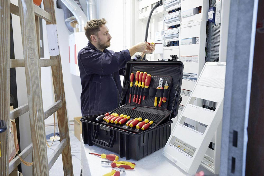 für die Elektroinstallation · viel zusätzlicher Stauraum mit individualisierbarer Bodeneinteilung · 71 Schlaufen und Dokumentenfach · bequemer Werkzeugtransport dank gepolstertem und einstellbarem Tragegurt · schützt die Finger bei zufallendem Kofferdeckel dank Gasdruckdämpfer · übersichtliche Organisation für müheloses Entnehmen der Werkzeuge · isolierte Werkzeuge geprüft gemäß IEC 60900