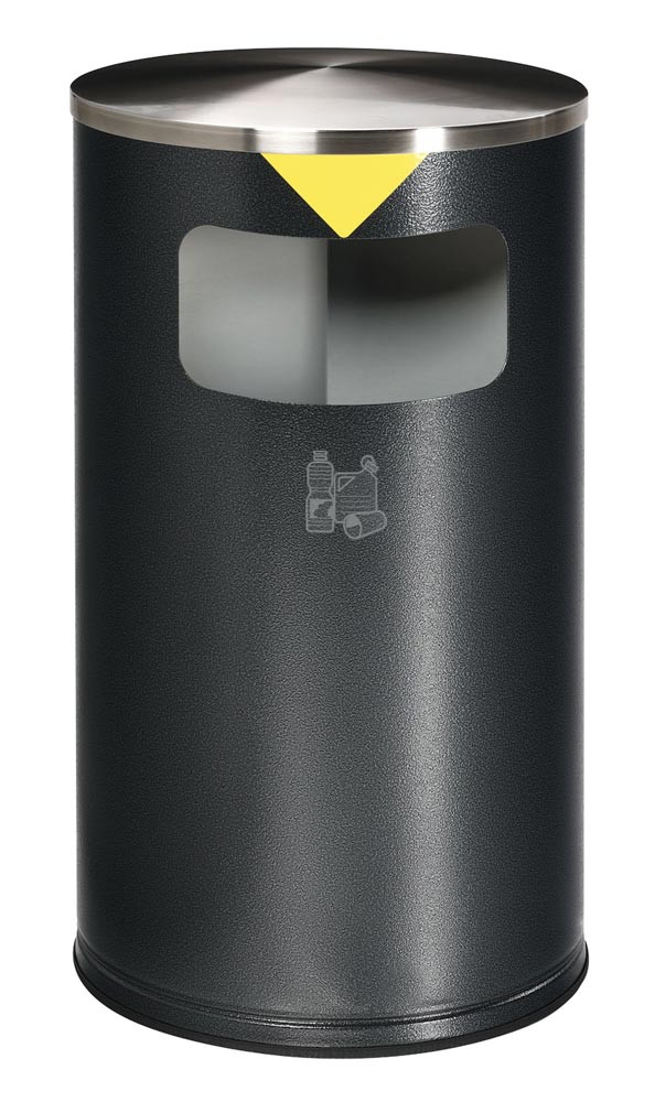 · 3 Einwürföfffnungen · Einsätze aus verzinktem Stahlblech mit einem Volumen von ca. 20 Litern · Abnehmbarer Deckel aus Edelstahl · Bodenbereich mit Kantenschutz augerüstet · Durchmesser 425 mm, Höhe 750 mm · Inklusive Pikogramme Wertstoffe (Farbecke gelb), Restmüll (Farbecke silber) und Papier (Farbecke blau)