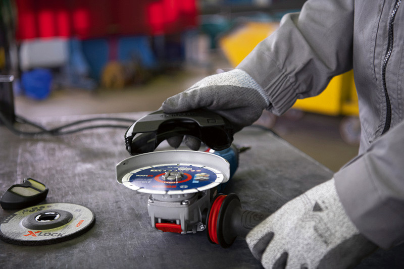Winkelschleifer mit X-LOCK GWX 14-125 S, Maximale Produktivität dank höherer Leistung und besserer Strapazierfähigkeit, ein verbesserter Staubschutz durch Lüftungsschlitze an der Werkzeugrückseite, Drehzahlvorwahl und ein deutlich kleinerer Griffumfang machen den GWX 14-125 S Professional bequem und effizient in der Anwendung. Der Zubehörwechsel ist dank des werkzeuglosen X-LOCK-Systems schnell, leicht und effizient. Ein erhöhter Anwenderschutz wird durch KickBack Control, Wiederanlaufschutz und einen Seitengriff mit Vibration Control gewährleistet. Der kompakte Winkelschleifer ist perfekt zum Schleifen von Metall und Schweißnähten sowie zum Schneiden von Metall, Beton, Mauerwerk und Fliesen. Er ist kompatibel mit den Bosch Staubabsaugsystemen GDE 125 EA-T Professional und GDE 115 / 125 FC-T Professional. Weitere Merkmale sind Drehzahlvorwahl, eine konstante Drehzahl, Sanftanlauf und Überlastschutz. Zusatzhandgriff Vibration Control (2 608 900 000). Schutzhaube (1 605 510 365). Anklippbare Trennschutzhaube aus Kunststoff (2 608 000 757). Karton